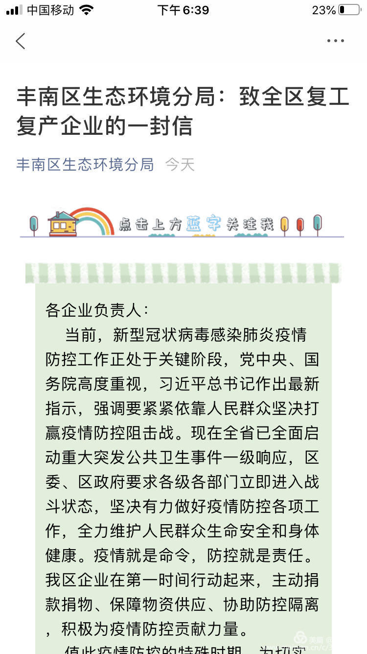 2.通过局微信公众号下发《致全区复工复产企业的一封信》,督导企业落实管控措施,加大对重点企业的执法力度。提醒企业做好疫情防控工作、切实履行生态环保主体责任,全面排查风险隐患。