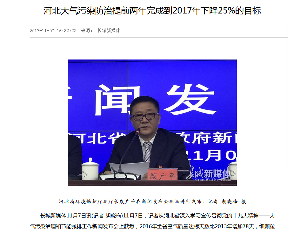 长城新媒体:河北大气污染防治提前两年完成到2017年下降25%的目标