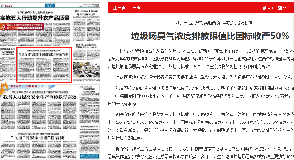 本报讯(记者段丽茜)从省环保厅3月21日召开的新闻发布会上了解到,我省两项地方标准《生活垃圾填埋场恶臭污染物排放标准》《医疗废物焚烧污染控制标准》将于今年4月1日起正式实施。这两个标准是国内首个针对生活垃圾填埋场恶臭污染物排放制订的地方标准,首个针对医疗废物焚烧控制制订的地方标准。