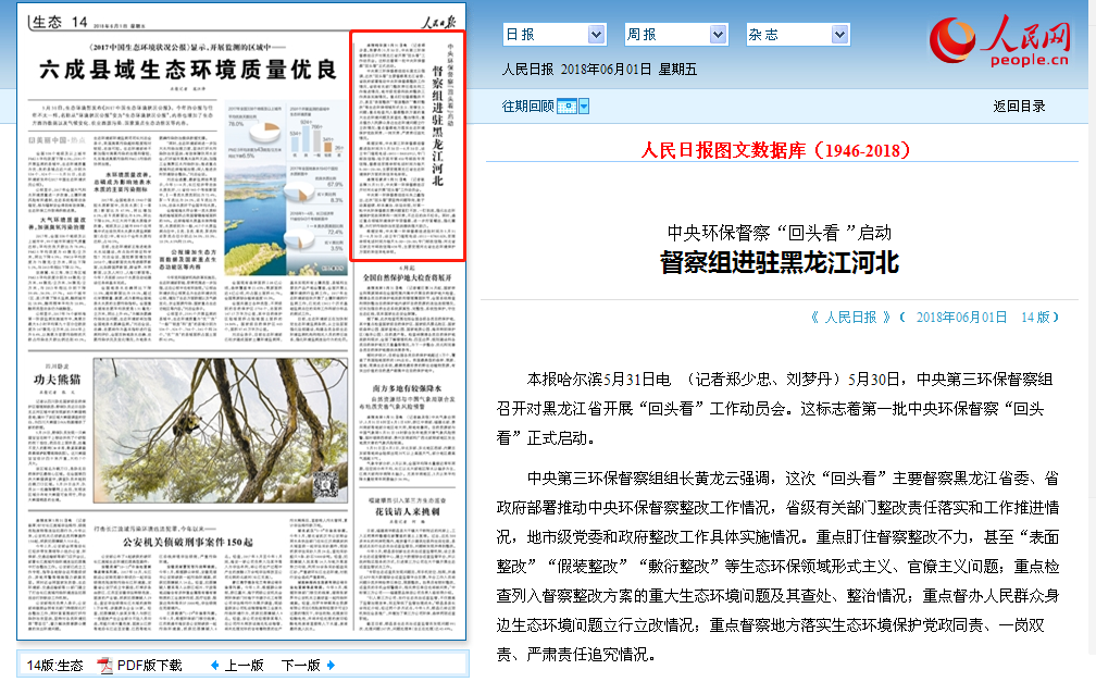 人民日报:中央环保督察“回头看”启动 督察组进驻黑龙江河北
