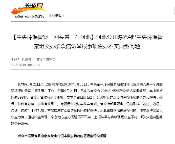 长城网:【中央环保督察“回头看”在河北】河北公开曝光4起中央环保督察组交办群众信访举报事项查办不实典型问题