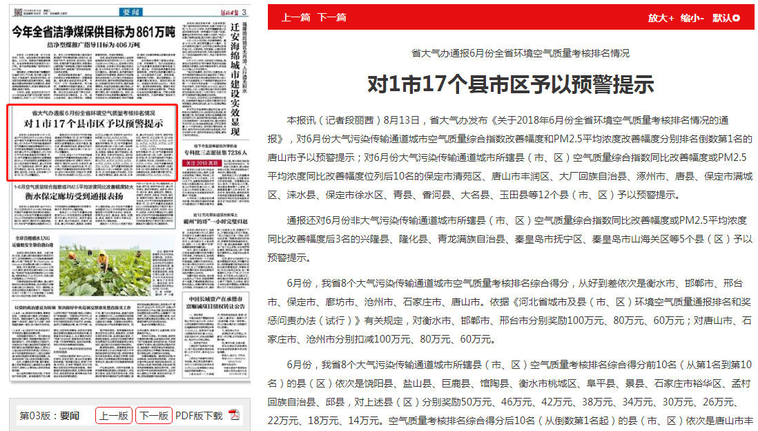 河北日报:省大气办通报6月份全省环境空气质量考核排名情况 对1市17个县市区予以预警提示