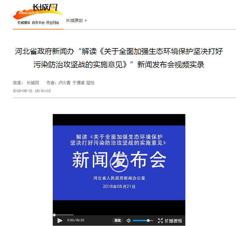 长城网:河北省政府新闻办“解读《关于全面加强91直播保护坚决打好污染防治攻坚战的实施意见》”新闻发布会视频实录 来源:省91直播宣传教育中心 时间:2018-08-22