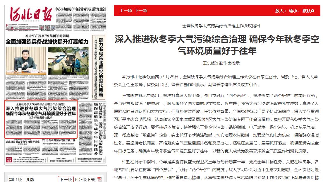河北日报:深入推进秋冬季大气污染综合治理 确保今年秋冬季空气环境质量好于往年