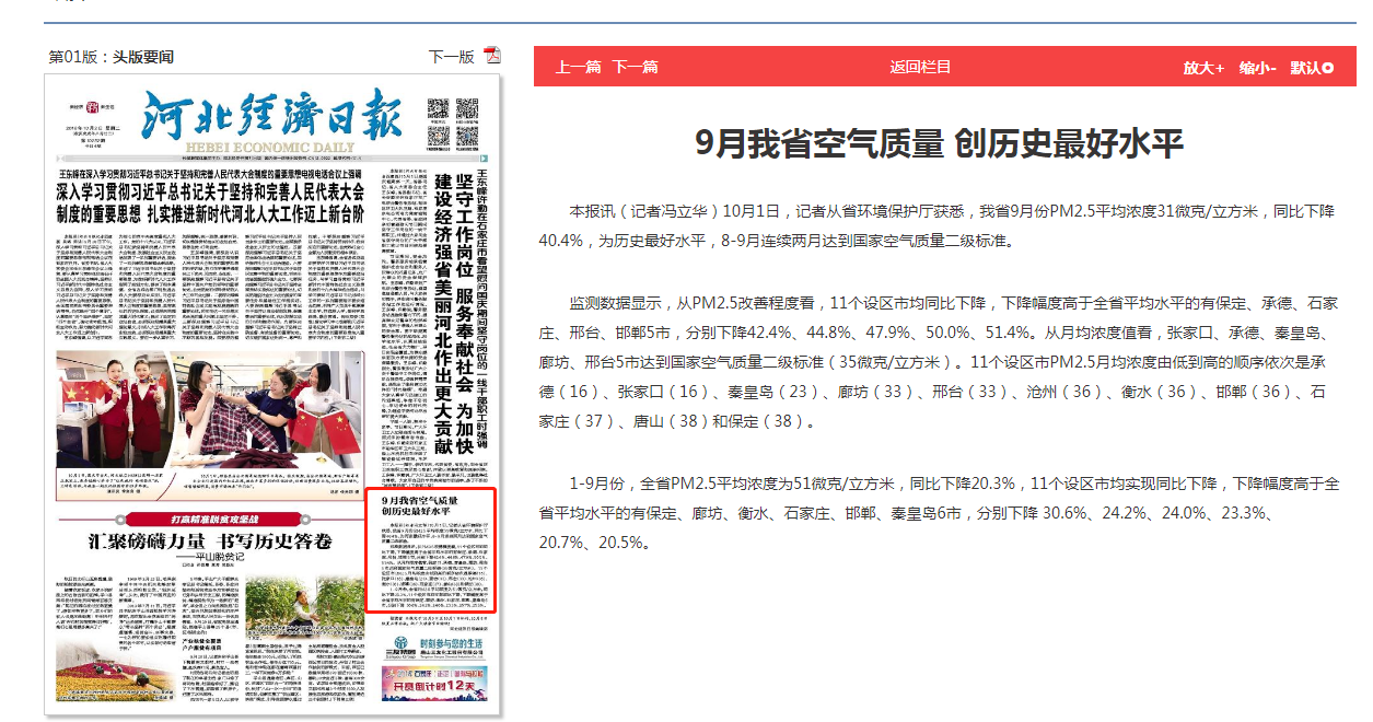 1-9月份,全省PM2.5平均浓度为51微克/立方米,同比下降20.3%,11个设区市均实现同比下降,下降幅度高于全省平均水平的有保定、廊坊、衡水、石家庄、邯郸、秦皇岛6市,分别下降 30.6%、24.2%、24.0%、23.3%、20.7%、20.5%。