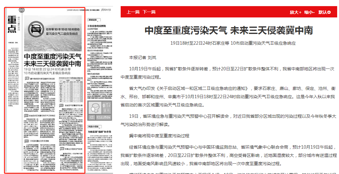 19日18时至22日24时石家庄等 10市启动重污染天气Ⅱ级应急响应