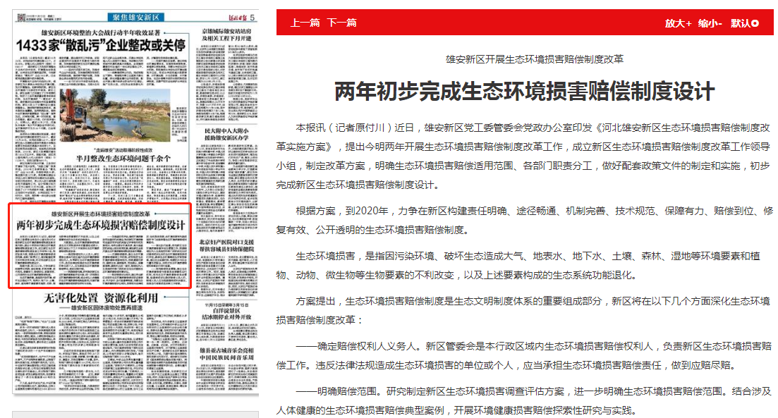 根据方案,到2020年,力争在新区构建责任明确、途径畅通、机制完善、技术规范、保障有力、赔偿到位、修复有效、公开透明的91直播损害赔偿制度。