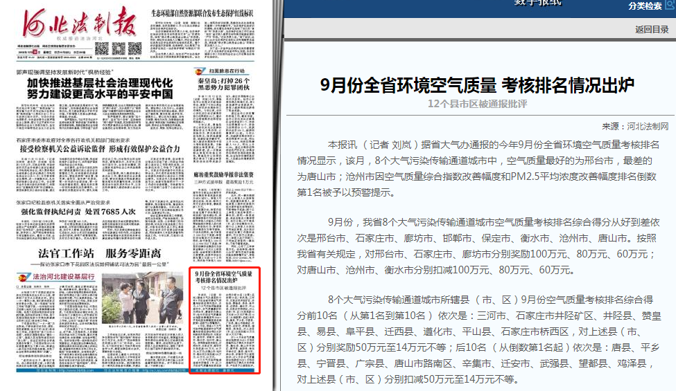 8个大气污染传输通道城市所辖县 (市、区)9月份空气质量考核排名综合得分前10名 (从第1名到第10名) 依次是:三河市、石家庄市井陉矿区、井陉县、赞皇县、易县、阜平县、迁西县、遵化市、平山县、石家庄市桥西区,对上述县(市、区)分别奖励50万元至14万元不等;后10名 (从倒数第1名起)依次是:唐县、平乡县、宁晋县、广宗县、唐山市路南区、辛集市、迁安市、武强县、望都县、鸡泽县,对上述县(市、区)分别扣减50万元至14万元不等。