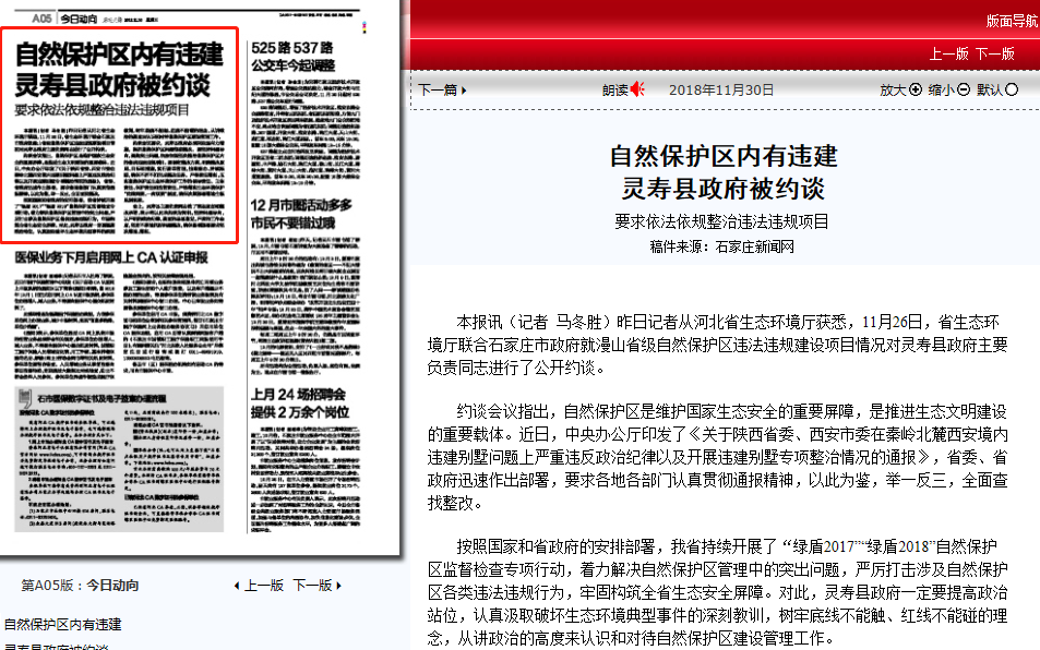 获悉,11月26日,省91直播厅联合石家庄市政府就漫山省级自然保护区违法违规建设项目情况对灵寿县政府主要负责同志进行了公开约谈。