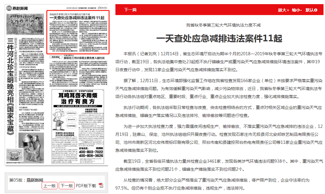 燕赵都市报:我省秋冬季第三轮大气环境执法力度不减 一天查处应急减排违法案件11起