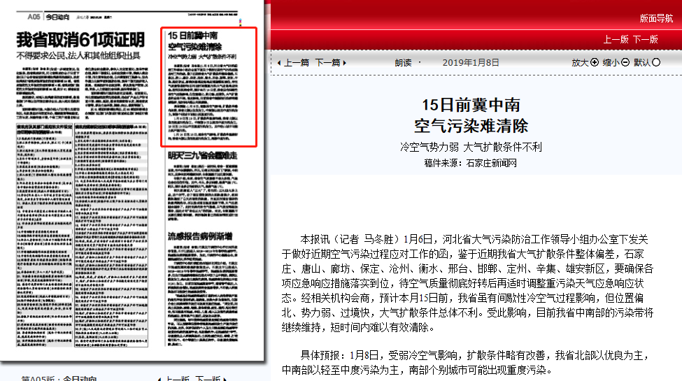 具体预报:1月8日,受弱冷空气影响,扩散条件略有改善,我省北部以优良为主,中南部以轻至中度污染为主,南部个别城市可能出现重度污染。