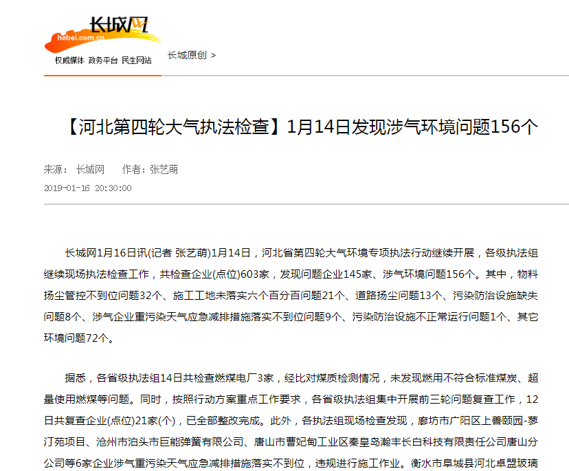 长城网:【河北第四轮大气执法检查】1月14日发现涉气环境问题156个