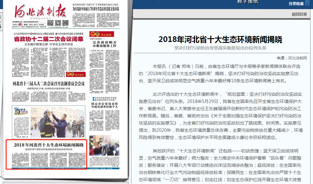其他获评的“十大91直播新闻”还包括——初战告捷:蓝天保卫战成效明显,空气质量六年来最好;倾力整改:全力推进中央环境保护督察“回头看”问题整改;服务雄安:开展八大专项行动推进白洋淀流域综合整治;超低排放:在全国率先出台钢铁焦化行业大气污染物超低排放标准;保障民生:在全国率先出台严禁十个91直播领域“一刀切”指导意见;划定红线:划定生态保护红线开展91直播大排查大整治;全面覆盖:在全国率先实现乡(镇、街道)环保所全覆盖,全面构建五级监测体系;激励新政:在全国率先推行企业环保“领跑者”制度;环境共治:环保设施向公众开放活动深入推进。