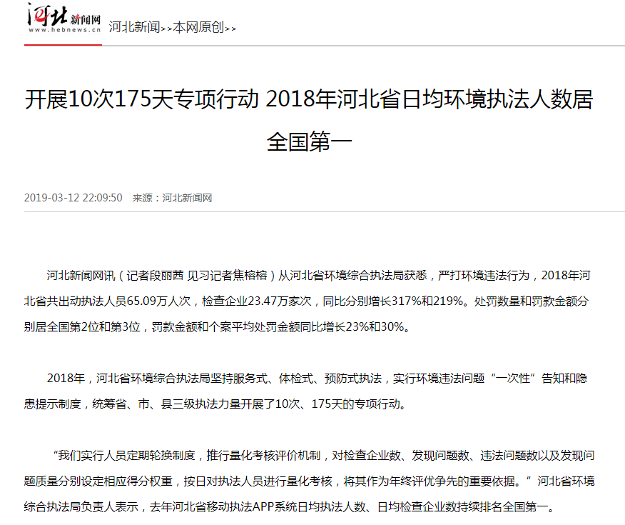 河北新闻网:开展10次175天专项行动 2018年河北省日均环境执法人数居全国第一