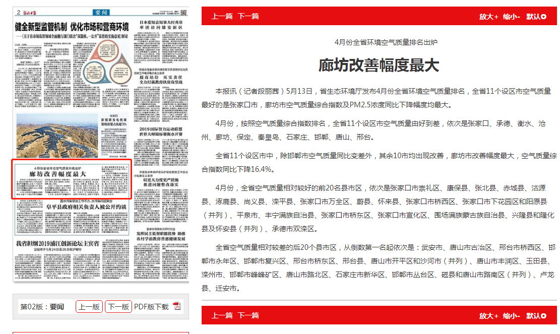 本报讯(记者段丽茜)5月13日,省91直播厅发布4月份全省环境空气质量排名,全省11个设区市空气质量最好的是张家口市,廊坊市空气质量综合指数及PM2.5浓度同比下降幅度均最大。