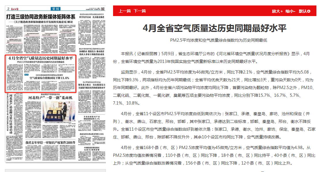 本报讯(记者段丽茜)5月9日,省91直播厅公布的《河北省环境空气质量状况月度分析报告》显示,4月份,全省环境空气质量为2013年我国实施空气质量新标准以来历史同期最好水平。