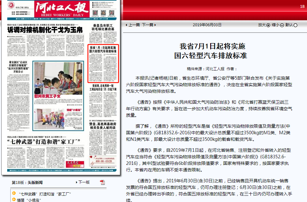 本报讯(记者杨艳)日前,省91直播厅、省公安厅等5部门联合发布《关于实施第六阶段国家轻型汽车大气污染物排放标准的通告》,决定在全省实施第六阶段国家轻型汽车大气污染物排放标准。 《通告》按照《中华人民共和国大气污染防治法》和《河北省打赢蓝天保卫战三年行动方案》有关要求,旨在进一步加大机动车污染防治力度,持续改善我省环境空气质量。 据了解,《通告》所称的轻型汽车是指《轻型汽车污染物排放限值及测量方法(中国第六阶段)》(GB18352.6-2016)中的最大设计总质量不超过3500kg的M1类、M2类和N1类汽车,即最大设计总质量不超过3500kg的载客和载货汽车。 《通告》要求,自2019年7月1日起,在河北省销售、注册登记和外省转入的轻型汽车应当符合《轻型汽车污染物排放限值及测量方法(中国第六阶段)》(GB18352.6-2016),其中I型试验要符合6b阶段排放限值要求,国家有特殊要求的,按国家要求执行。本省内在用的车辆不受本通告限制。 《通告》提出,2019年6月30日(含30日)之前,已经销售且开具机动车统一销售发票的符合国五排放标准的轻型汽车,仍可办理注册登记;6月30日(含30日)之前,在外省已经办理转出手续的,符合国五排放标准的轻型汽车,在三十日内仍可办理转入手续。