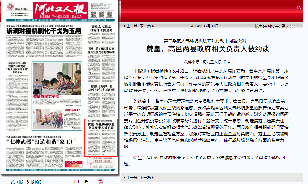 本报讯(记者杨艳)5月31日,记者从河北91直播厅获悉,省91直播厅第一环境监察专员办公室约谈了第二季度大气环境执法专项行动中问题突出的赞皇县和解除区域限批后不能认真执行省大气办工作要求的高邑县人民政府相关负责人,要求进一步提高政治站位,强化责任落实,深化问题整改,全力推进大气污染综合治理。 约谈会上,省91直播厅环境监察专员张桂生要求,赞皇县、高邑县要认清当前形势,增强打赢蓝天保卫战的紧迫感。要将实现本区域大气环境质量的改善作为落实习近平生态文明思想的重要举措,切实增强打赢蓝天保卫战的紧迫感,对约谈通报的问题要专门召开县委常委会和政府常务会进行专题研究,统一思想,制定措施,压实责任,落实到位,扎扎实实做好各项大气污染综合治理具体工作。两县政府相关职能部门要按照职责分工,制定监督检查方案,加强对本辖区内工业企业污染防治、施工工地或物料堆场扬尘污染、重污染天气应急和采暖季错峰生产、秸秆或垃圾焚烧等方面的监管力度。 赞皇、高邑两县政府相关负责人作了表态,坚决诚恳接受约谈,全盘接受通报问题。