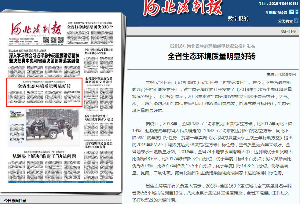 据统计,2018年,全省PM2.5平均浓度为56微克/立方米,比2017年同比下降14%,超额完成年初省人代会确定的“PM2.5平均浓度达到62微克/立方米,同比下降5%”的年度目标任务,提前一年实现《河北省打赢蓝天保卫战三年行动方案》提出的2019年PM2.5平均浓度达到58微克/立方米目标任务,空气质量为六年来最好。全省地表水环境质量好转。2018年,全省74个地表水国考断面中,达到或优于Ⅲ类断面比例为48.6%,比2017年升高6.3个百分点,优于年度目标4个百分点;劣Ⅴ类断面比例为20.3%,比2017年降低 13.5个百分点,优于年度目标14.8个百分点。化学需氧量、氨氮、二氧化硫、氮氧化物四项主要污染物均完成国家下达的减排目标任务。