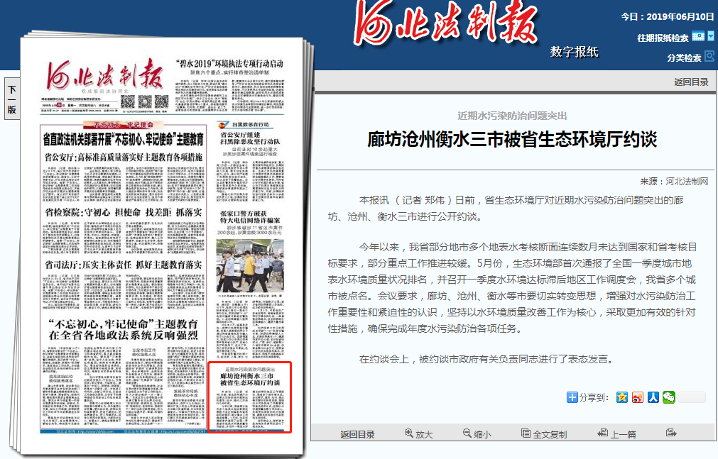 本报讯 (记者 郑伟)日前,省91直播厅对近期水污染防治问题突出的廊坊、沧州、衡水三市进行公开约谈。