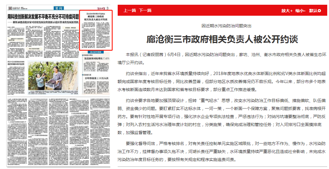 本报讯(记者段丽茜)6月4日,因近期水污染防治问题突出,廊坊、沧州、衡水市政府相关负责人被省91直播厅公开约谈。