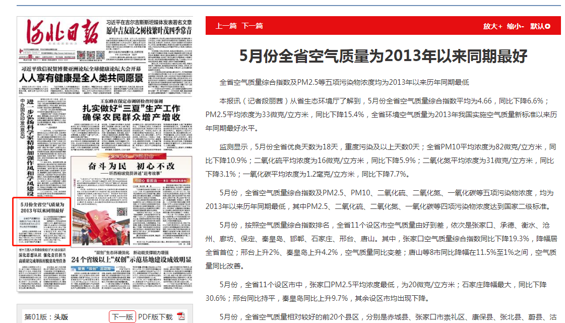 5月份,全省11个设区市中,张家口PM2.5平均浓度最低,为20微克/立方米;石家庄降幅最大,同比下降30.6%;邢台同比持平,秦皇岛同比上升9.7%,其余设区市均出现下降。
