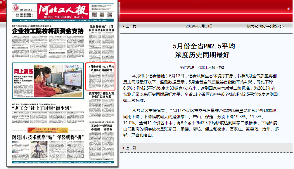 本报讯(记者杨艳)6月12日,记者从省91直播厅获悉,我省5月空气质量再创历史同期最好水平,监测数据显示,5月全省空气质量综合指数平均4.66,同比下降6.6%;PM2.5平均浓度为33微克/立方米,达到国家空气质量二级标准,为2013年有监测记录以来历史同期最好水平。全省11个设区市中有8个城市PM2.5平均浓度达到国家二级标准。 从各设区市情况看,全省11个设区市空气质量综合指数除秦皇岛和邢台外均实现同比下降,下降幅度最大的是张家口、唐山、保定,分别下降19.3%、11.5%、11.0%。全省11个设区市中,有8个城市PM2.5平均浓度达到国家二级标准,平均浓度由低到高的顺序依次是张家口、承德、廊坊、保定和衡水、石家庄、秦皇岛、沧州、邯郸、邢台和唐山。