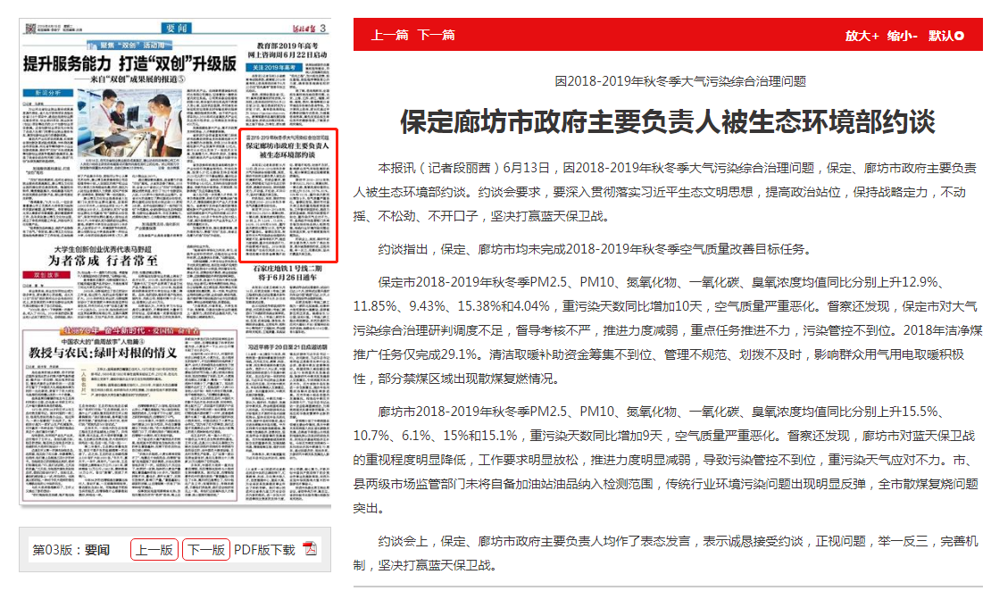 约谈会上,保定、廊坊市政府主要负责人均作了表态发言,表示诚恳接受约谈,正视问题,举一反三,完善机制,坚决打赢蓝天保卫战。
