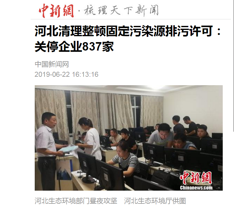 中新社:河北清理整顿固定污染源排污许可:关停企业837家