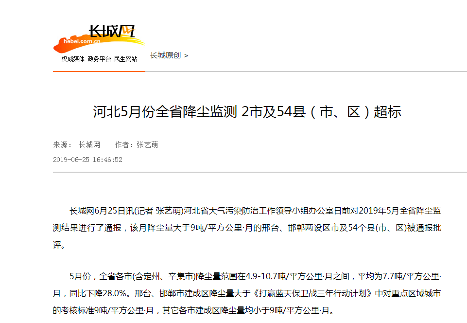 长城网6月25日讯(记者 张艺萌)河北省大气污染防治工作领导小组办公室日前对2019年5月全省降尘监测结果进行了通报,该月降尘量大于9吨/平方公里·月的邢台、邯郸两设区市及54个县(市、区)被通报批评。
