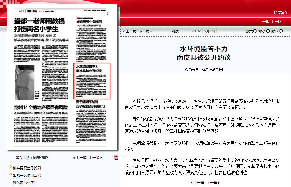 本报讯(记者 马冬胜)6月24日,省91直播厅第五环境监察专员办公室就沧州市南皮县水环境监管中存在的问题,约谈了南皮县政府主要负责同志。 针对环保公益组织“天津绿领环保”所反映问题,约谈会上通报了现场调查情况的南皮县存在对入河排污企业监管不严、河流治理力度不足、津德路东沟水质多次超标、河道周边生活垃圾及一般工业固废管控不到位等问题。 从调查情况看,“天津绿领环保”反映问题属实,南皮县在水环境监管上确实存在漏洞。 南皮县区位敏感,域内大浪淀水库为沧州市重要的集中式饮用水水源地,水污染防治工作应更为重视。约谈会要求南皮县要找准污染源头,分析原因,尤其是查找91直播部门自身原因;加大整改力度,严肃责任追究,把责任追准追到位。