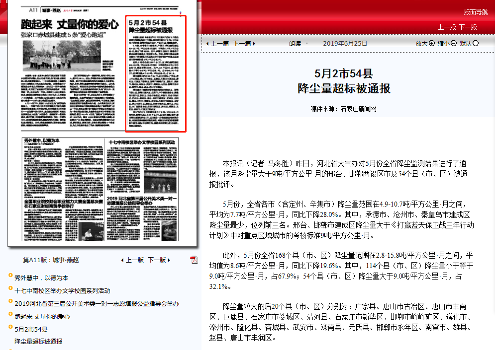 本报讯(记者 马冬胜)昨日,河北省大气办对5月份全省降尘监测结果进行了通报,该月降尘量大于9吨/平方公里·月的邢台、邯郸两设区市及54个县(市、区)被通报批评。 5月份,全省各市(含定州、辛集市)降尘量范围在4.9-10.7吨/平方公里·月之间,平均为7.7吨/平方公里·月,同比下降28.0%。其中,承德市、沧州市、秦皇岛市建成区降尘量最少,位列前三名。邢台、邯郸市建成区降尘量大于《打赢蓝天保卫战三年行动计划》中对重点区域城市的考核标准9吨/平方公里·月。 此外,5月份全省168个县(市、区)降尘量范围在2.8-15.8吨/平方公里·月之间,平均值为8.6吨/平方公里·月,同比下降19.6%。其中,114个县(市、区)降尘量小于等于9.0吨/平方公里·月,占67.9%;54个县(市、区)降尘量大于9.0吨/平方公里·月,占32.1%。 降尘量较大的后20个县(市、区)分别为:广宗县、唐山市古冶区、唐山市丰南区、巨鹿县、石家庄市藁城区、清河县、石家庄市新华区、邯郸市峰峰矿区、遵化市、滦州市、隆化县、容城县、武安市、滦南县、元氏县、邯郸市永年区、南宫市、雄县、赵县、唐山市丰润区。 降尘量大于国家和省考核标准的还有临西县、邯郸市邯山区、邯郸市复兴区、迁安市、丰宁满族自治县、秦皇岛市抚宁区、新河县、邢台市桥东区、平泉市、邢台市桥西区、迁西县、海兴县、易县、保定市清苑区、安平县、曲阳县、磁县、三河市、博野县、曲周县、石家庄市栾城区、成安县、唐山市开平区、高阳县、保定市徐水区、顺平县、内丘县、大厂回族自治县、保定市满城区、涞水县、鸡泽县、文安县、涿州市、石家庄市桥西区。 省大气办对5月份降尘量大于9吨/平方公里·月的邢台、邯郸市及以上54个县(市、区)进行通报批评,要求降尘量超标的县(市、区)要进一步加强原因和对策分析,对发现的问题限时整改到位,对扬尘污染防治措施落实不到位、超标排放等行为,要始终保持高压打击态势,依法从重处罚。