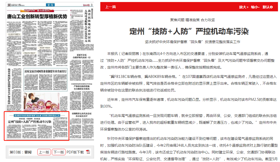 “机动车尾气遥感监测系统一旦发现问题车辆,就会立即报警,再由环保、公安、交通部门组成的联合执法组进行处理。由于监管收严,进入我市的超标载重车辆明显减少,既缓解了交通压力,也减少了污染。”定州市中央环保督察整改办公室的符涛说。
