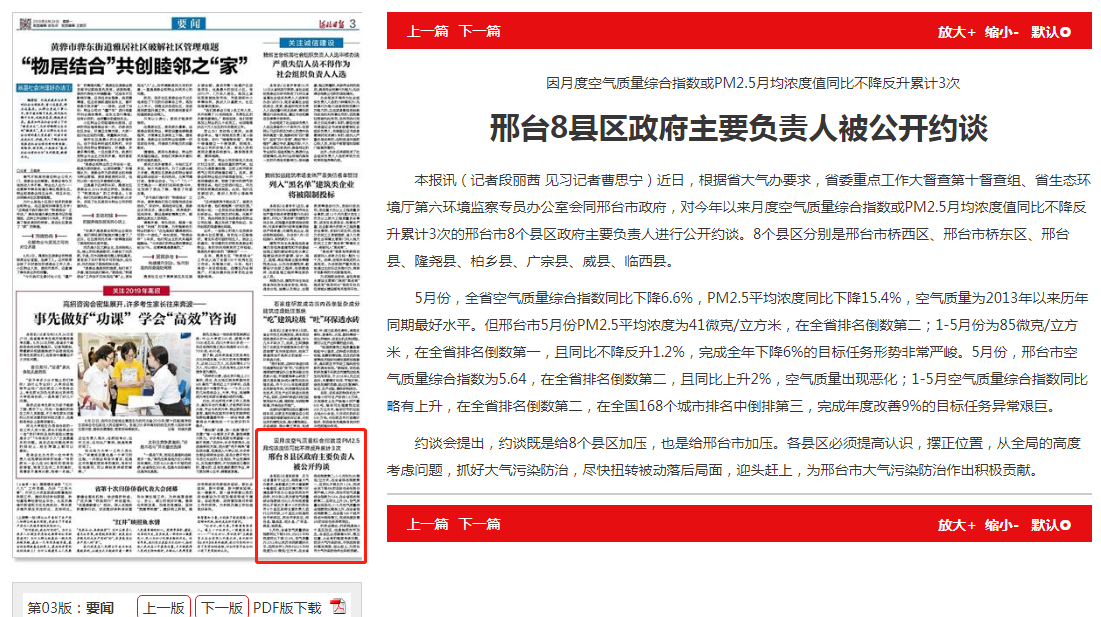 约谈会提出,约谈既是给8个县区加压,也是给邢台市加压。各县区必须提高认识,摆正位置,从全局的高度考虑问题,抓好大气污染防治,尽快扭转被动落后局面,迎头赶上,为邢台市大气污染防治作出积极贡献。