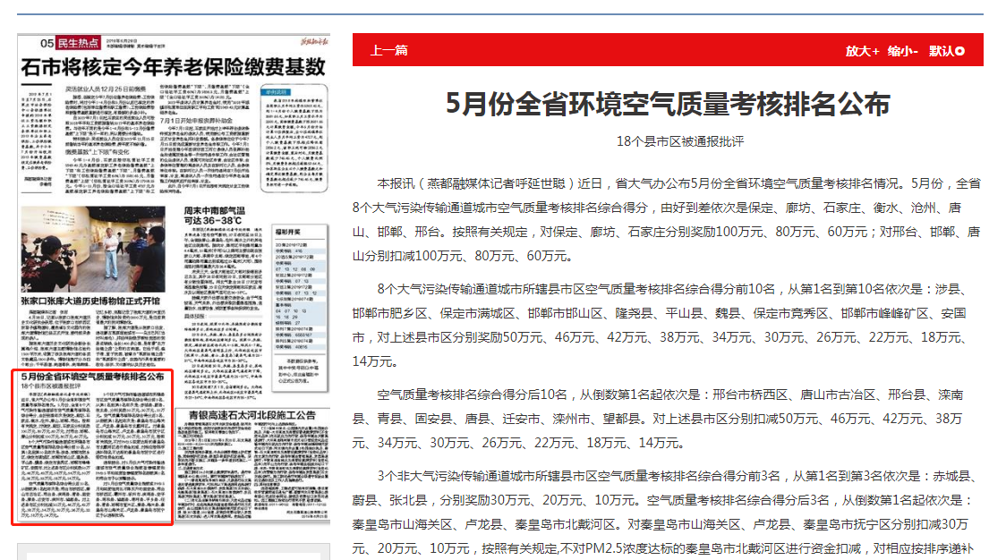 通报提出,对5月份大气污染传输通道城市空气质量综合指数改善幅度和PM2.5平均浓度改善幅度排名倒数第1名的邢台市予以预警提示。