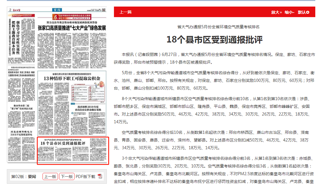 5月份,全省8个大气污染传输通道城市空气质量考核排名综合得分,从好到差依次是保定、廊坊、石家庄、衡水、沧州、唐山、邯郸、邢台。按照有关规定,对保定、廊坊、石家庄分别奖励100万元、80万元、60万元;对邢台、邯郸、唐山分别扣减100万元、80万元、60万元。