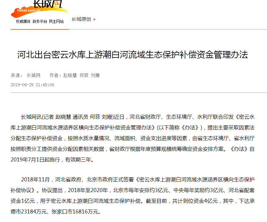 2018年11月,河北省政府、北京市政府正式签署《密云水库上游潮白河流域水源涵养区横向生态保护补偿协议》。协议提出,2018年至2020年,北京市每年安排约3亿元、中央每年奖励约3亿元、河北省配套资金1亿元,用于密云水库上游潮白河流域生态保护补偿。截至目前,共计到位资金4亿元,其中,下达承德市23184万元、张家口市16816万元。