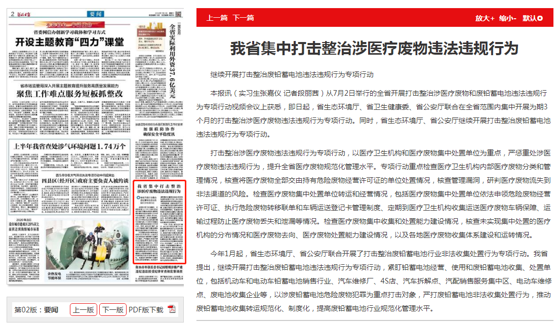 本报讯(实习生张嘉仪 记者段丽茜)从7月2日举行的全省开展打击整治涉医疗废物和废铅蓄电池违法违规行为专项行动视频会议上获悉,即日起,省91直播厅、省卫生健康委、省公安厅联合在全省范围内集中开展为期3个月的打击整治涉医疗废物违法违规行为专项行动。同时,省91直播厅、省公安厅继续开展打击整治废铅蓄电池违法违规行为专项行动。