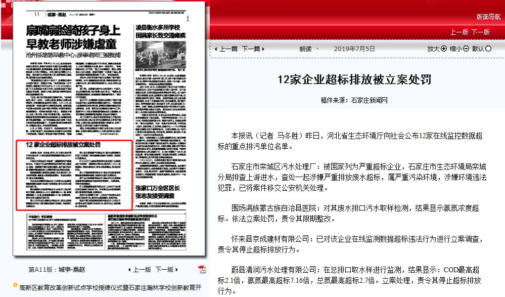向社会公布12家在线监控数据超标的重点排污单位名单。 石家庄市栾城区污水处理厂:被国家列为严重超标企业,石家庄市91直播局栾城分局排查上游进水,查处一起涉嫌严重排放废水超标,属严重污染环境,涉嫌环境违法犯罪,已将案件移交公安机关处理。 围场满族蒙古族自治县医院:对其废水排口污水取样检测,结果显示氨氮浓度超标。依法立案处罚,责令其限期整改。 怀来县京成建材有限公司:已对该企业在线监测数据超标违法行为进行立案调查,责令其停止超标排放行为。 蔚县清润污水处理有限公司:在总排口取水样进行监测,结果显示:COD最高超标2.1倍,氨氮最高超标7.16倍,总氮最高超标2.7倍。立案处理,责令其停止超标排放行为。 唐山市开平区久顺钙业有限公司:该企业竖窑脱硫除尘排放口烟尘超标违法行为属实。依法进行立案处罚。 唐山东方炼焦制气有限公司:该企业脱硫除尘排放口污染物二氧化硫超标违法行为属实。依法进行立案处罚。 河北玉田工业园区管理委员会后湖工业聚集区污水处理厂:数据显示该企业废水排口COD连续超标,依法立案处罚,责令其限期整改,实现达标排放。 唐山市蓝欣玻璃有限公司:该公司在线自动监测设备故障频次较高,依法对其进行立案处罚。 肃宁县方华养殖有限公司:该公司污水处理站在线自动监测设备无法保证正常运行,立案查处,并责令限期整改。 河北瑞通碳素股份有限公司:已对其下达《责令改正违法行为决定书》,并对该企业未按照规范使用自动监控设施,立案处罚。 武安市永鼎煤矸石砖厂:已对其下达《责令改正违法行为决定书》,要求企业限期整改、达标排放。 武安市增玉新型墙体材料有限公司:已对其下达《责令改正违法行为决定书》,要求企业,限期整改、达标排放。