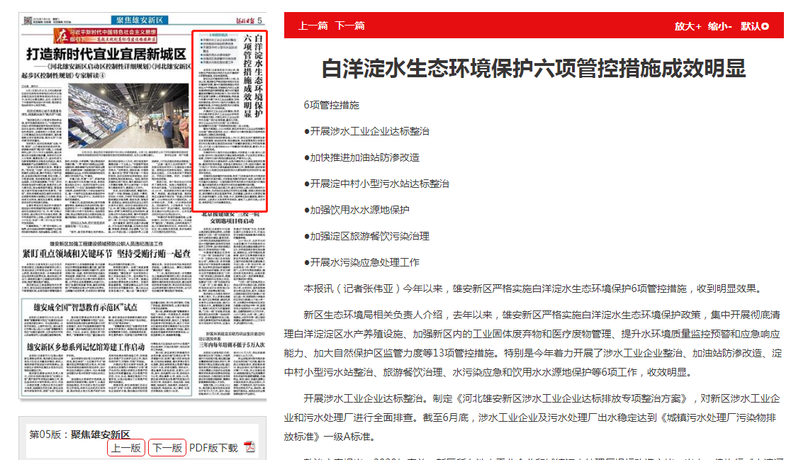 整治方案提出,2020年底前,新区所有涉水工业企业和城镇污水处理厂提标改造完毕,出水一律执行《大清河流域水污染物排放标准》核心控制区排放限值。