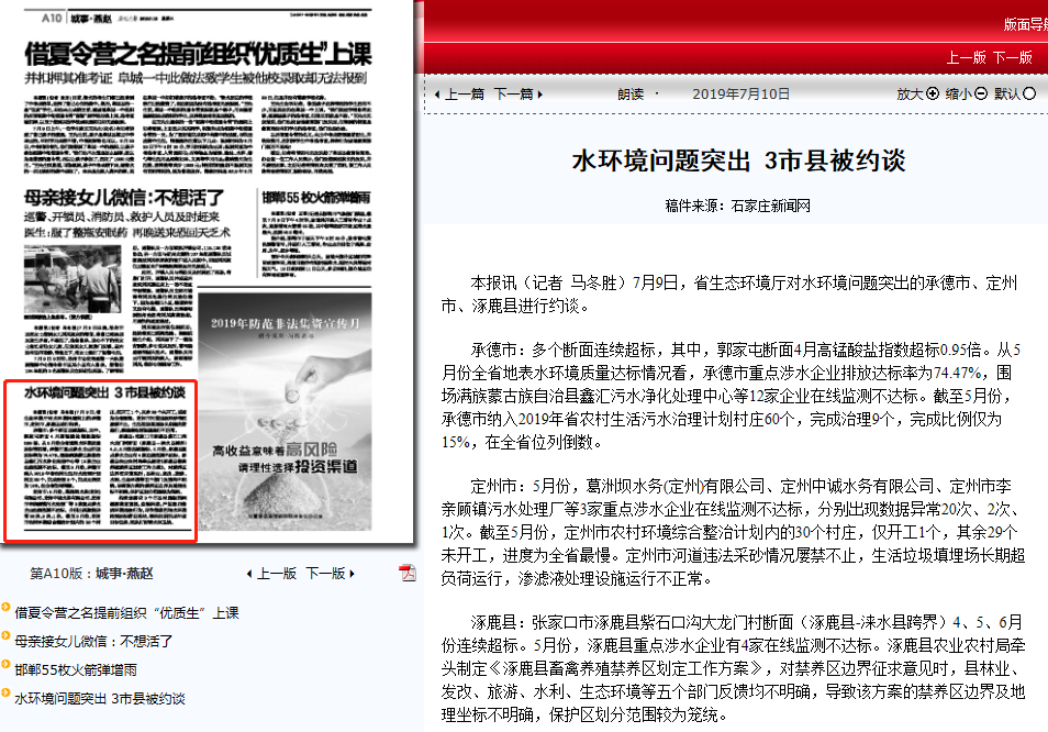 本报讯(记者 马冬胜)7月9日,省91直播厅对水环境问题突出的承德市、定州市、涿鹿县进行约谈。 承德市:多个断面连续超标,其中,郭家屯断面4月高锰酸盐指数超标0.95倍。从5月份全省地表水环境质量达标情况看,承德市重点涉水企业排放达标率为74.47%,围场满族蒙古族自治县鑫汇污水净化处理中心等12家企业在线监测不达标。截至5月份,承德市纳入2019年省农村生活污水治理计划村庄60个,完成治理9个,完成比例仅为15%,在全省位列倒数。 定州市:5月份,葛洲坝水务(定州)有限公司、定州中诚水务有限公司、定州市李亲顾镇污水处理厂等3家重点涉水企业在线监测不达标,分别出现数据异常20次、2次、1次。截至5月份,定州市农村环境综合整治计划内的30个村庄,仅开工1个,其余29个未开工,进度为全省最慢。定州市河道违法采砂情况屡禁不止,生活垃圾填埋场长期超负荷运行,渗滤液处理设施运行不正常。 涿鹿县:张家口市涿鹿县紫石口沟大龙门村断面(涿鹿县-涞水县跨界)4、5、6月份连续超标。5月份,涿鹿县重点涉水企业有4家在线监测不达标。涿鹿县农业农村局牵头制定《涿鹿县畜禽养殖禁养区划定工作方案》,对禁养区边界征求意见时,县林业、发改、旅游、水利、91直播等五个部门反馈均不明确,导致该方案的禁养区边界及地理坐标不明确,保护区划分范围较为笼统。 约谈会要求3个市县对通报的问题要高度重视,追根问底,严惩重罚各类环境违法行为,尽快彻底扭转水环境治理达标滞后现状,确保如期完成年度目标任务,坚决打好碧水保卫战。