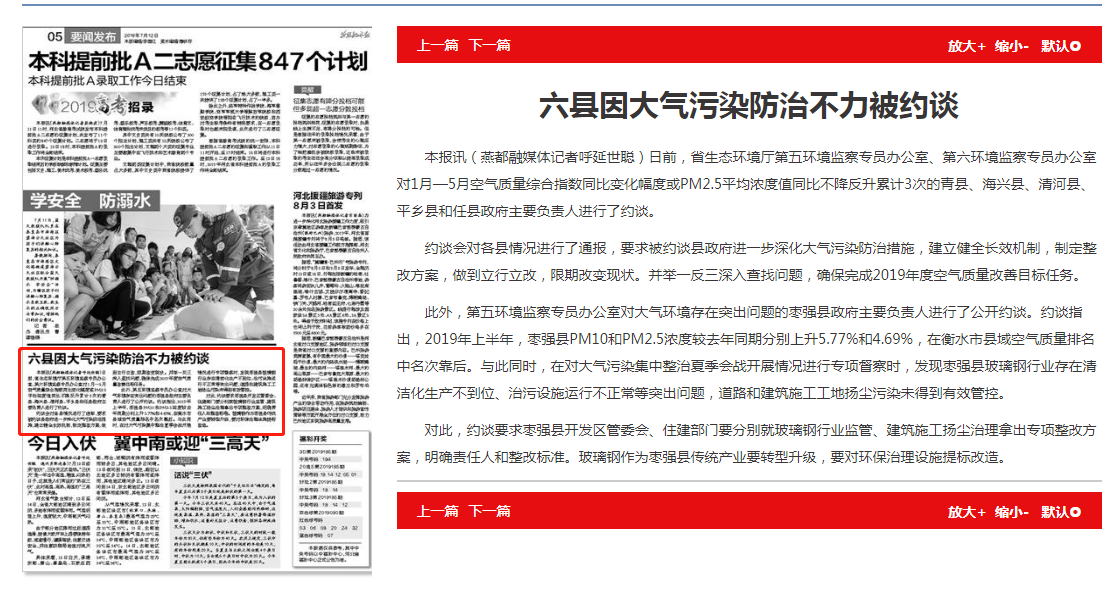 此外,第五环境监察专员办公室对大气环境存在突出问题的枣强县政府主要负责人进行了公开约谈。约谈指出,2019年上半年,枣强县PM10和PM2.5浓度较去年同期分别上升5.77%和4.69%,在衡水市县域空气质量排名中名次靠后。与此同时,在对大气污染集中整治夏季会战开展情况进行专项督察时,发现枣强县玻璃钢行业存在清洁化生产不到位、治污设施运行不正常等突出问题,道路和建筑施工工地扬尘污染未得到有效管控。