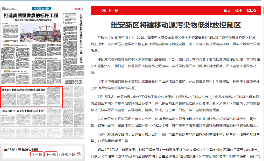 移动源污染物低排放控制区划定范围为雄安新区全部行政区划,管控对象主要包括非道路移动机械、重型柴油车和轻型汽车。即日起,新区将严格控制移动源污染,实行国内最严格的机动车排放标准,严格监管非道路移动源。