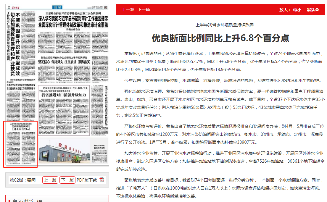 强化流域水环境治理。我省组织各地制定地表水国考断面水质保障方案,逐一明确管控措施和重点工程项目清单。唐山、廊坊、邢台市还开展了水功能区与水环境控制单元整合试点。截至目前,全省37个不达标水体中有35个完成年度改善目标任务;列入整治范围的58条重污染河流(段)53条已达标,43条城市黑臭水体已完成整治任务,剩余5条正在整治中。