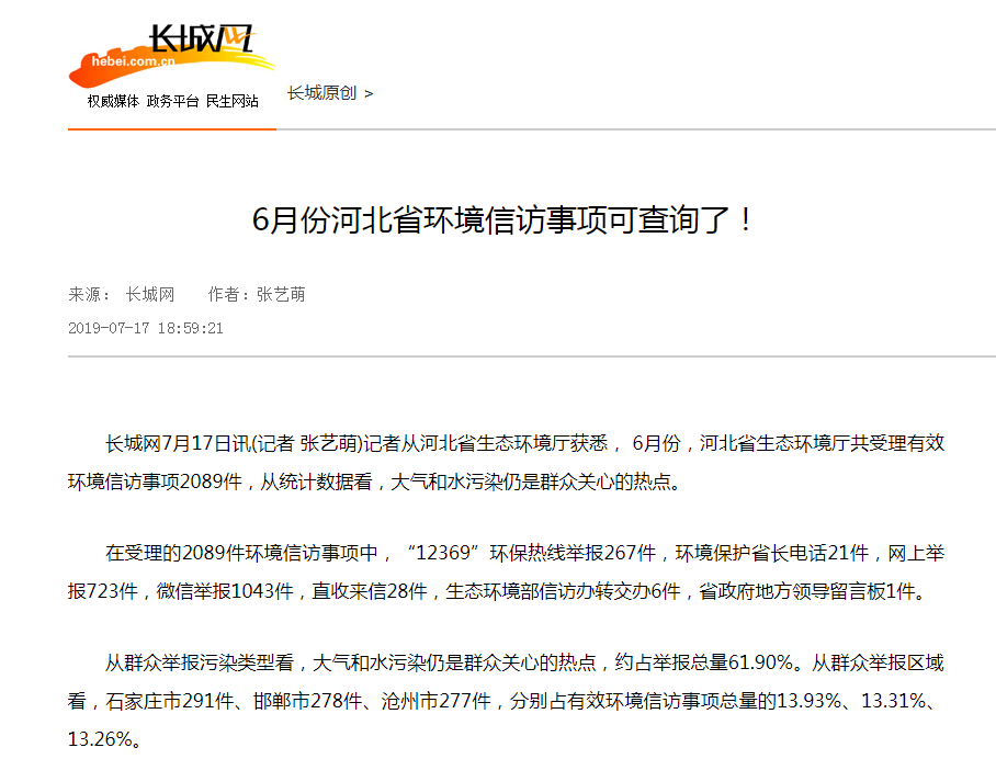 从群众举报污染类型看,大气和水污染仍是群众关心的热点,约占举报总量61.90%。从群众举报区域看,石家庄市291件、邯郸市278件、沧州市277件,分别占有效环境信访事项总量的13.93%、13.31%、13.26%。