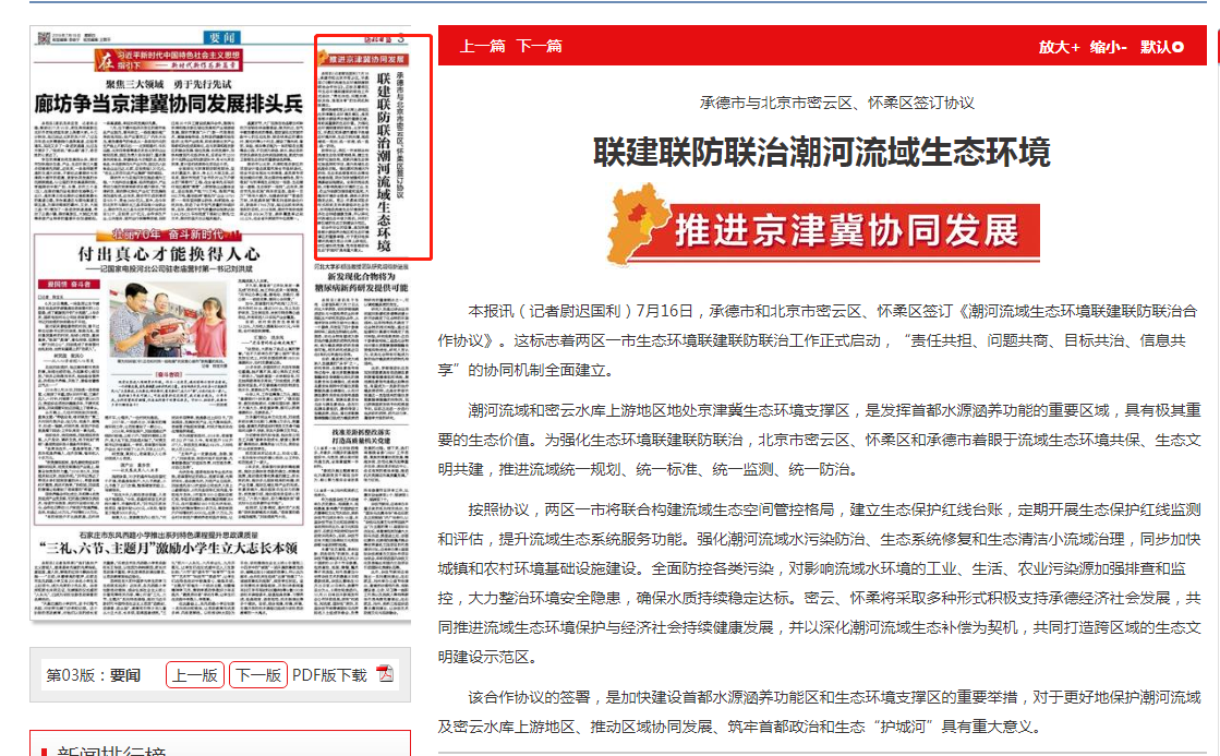 本报讯(记者尉迟国利)7月16日,承德市和北京市密云区、怀柔区签订《潮河流域91直播联建联防联治合作协议》。这标志着两区一市91直播联建联防联治工作正式启动,“责任共担、问题共商、目标共治、信息共享”的协同机制全面建立。