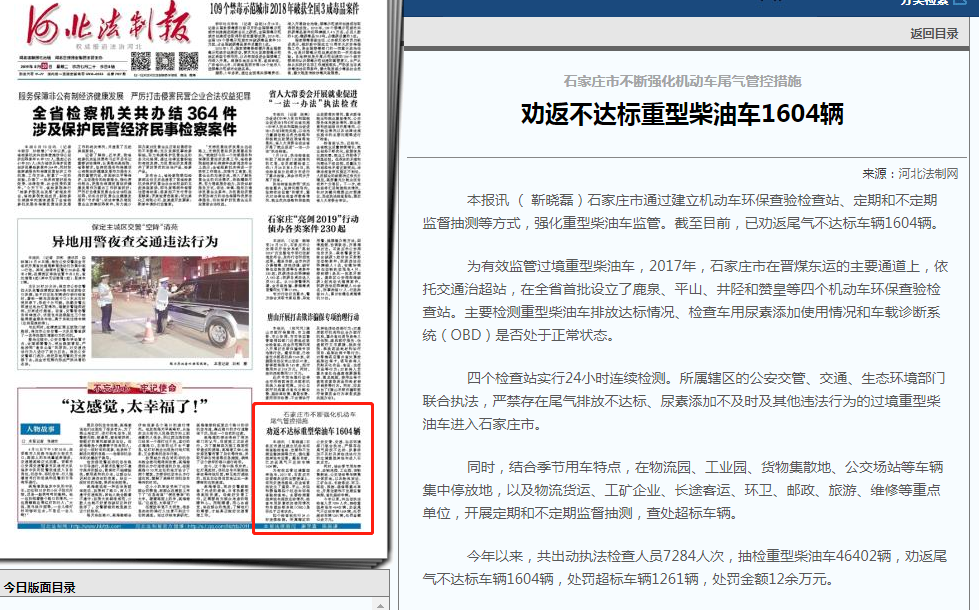 为有效监管过境重型柴油车,2017年,石家庄市在晋煤东运的主要通道上,依托交通治超站,在全省首批设立了鹿泉、平山、井陉和赞皇等四个机动车环保查验检查站。主要检测重型柴油车排放达标情况、检查车用尿素添加使用情况和车载诊断系统(OBD)是否处于正常状态。