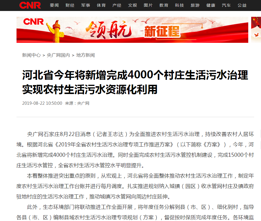 央广网石家庄8月22日消息(记者王志达)为全面推进农村生活污水治理,持续改善农村人居环境。根据河北省《2019年全省农村生活污水治理专项工作推进方案》(以下简称《方案》),今年,河北省将新增完成4000个村庄生活污水治理。同时全面完成农村生活污水管控机制建设,完成15000个村庄生活污水管控,全省农村生活污水管控水平明显提升。