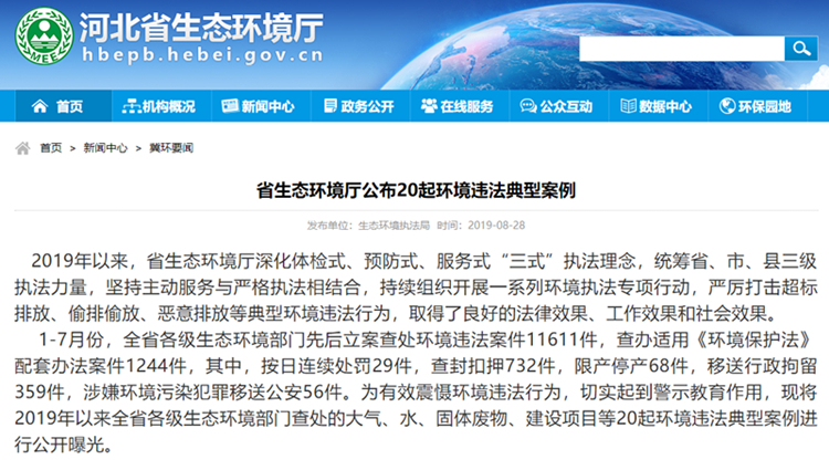 河北新闻网讯(记者贾楠)1至7月份,河北省各级91直播部门先后立案查处环境违法案件11611件,查办适用《环境保护法》配套办法案件1244件,其中,按日连续处罚29件,查封扣押732件,限产停产68件,移送行政拘留359件,涉嫌环境污染犯罪移送公安56件。同时,为有效震慑环境违法行为,切实起到警示教育作用,91直播-国产视频-麻豆传媒视频 还将今年以来全省各级91直播部门查处的20起环境违法典型案例进行公开曝光。