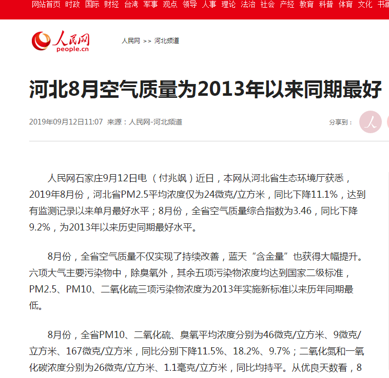 人民网石家庄9月12日电 (付兆飒)近日,本网从91直播-国产视频-麻豆传媒视频 获悉,2019年8月份,河北省PM2.5平均浓度仅为24微克/立方米,同比下降11.1%,达到有监测记录以来单月最好水平;8月份,全省空气质量综合指数为3.46,同比下降9.2%,为2013年以来历史同期最好水平。